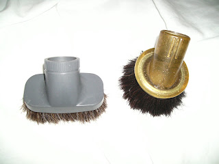 Those two dusting tools are from way back in the day. The squarish one is from Kenmore. It goes as far back as maybe the 1970s and and the round one is so standard it's hard to guess. The color suggests that it might have come off a Compact but I don't think so becaues of the look of the neck. As far as our history goes, swivel neck dusting tools are new. However, vacuums that used curved wands like Filter Queen, GE and Rainbow were a lttle more convenient for dusting the tops of doors and other high flat aras. Kirby was good for this too. Our Air-Way used a vee-shaped dusting tool throughout manufacture, many, many years and Electrolux devised a combination tool back in the 1950s that still exists Europe, or should I say Asia, has had strong influence on floor tool design. I'm not very appreciative of the new ideas as they employ the red velcro strip for routing surface litter and not floating brush strips as in past. Electrolux, Air-Way, Filtex and Westinghouse (at one time) developed rug nozzles that did not use brush strips. I have heard of no animal rights protestors input but the interestng aspect here is that mainly animal hair was used for the the brushes in all these tools. I pretty sure horses are glad fo the doing away with of "glue factories" but I am curioous to learn how and why the transition was made. For all the bacon that turns up on our table, there an awful lot of scrub brushes with plastic bristles around I still much prefer vacuum attachments that employ brushes made from animal hair Venson Yes, Venson, the brush on the right is from a Compact/Tristar; I've had it since 1985 (bought new) & its the best til I got the one on the left; which doesn't tend to suck delicate surfaces (drapes)
